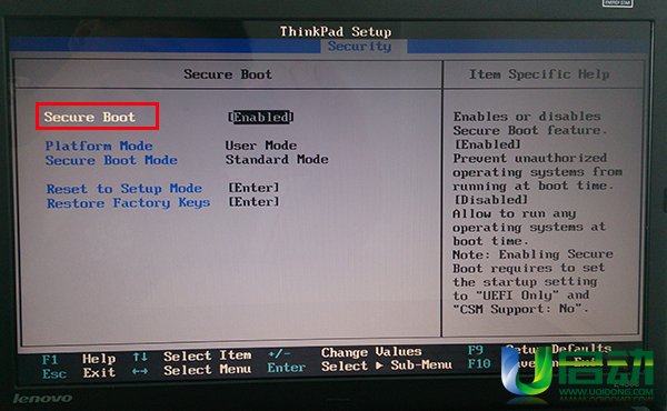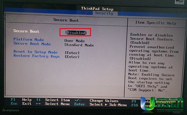 5、完成上面的操作后,secure boot的屬性就修改為“disabled”,然后按esc鍵返回上一步,如下圖所示:
