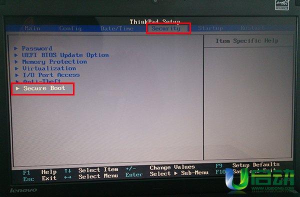 2、使用鍵盤上的左右方向鍵將光標移至“security”欄目,再使用上下方向鍵將光標移至“secure boot”選項,按回車鍵執(zhí)行,如下圖所示: