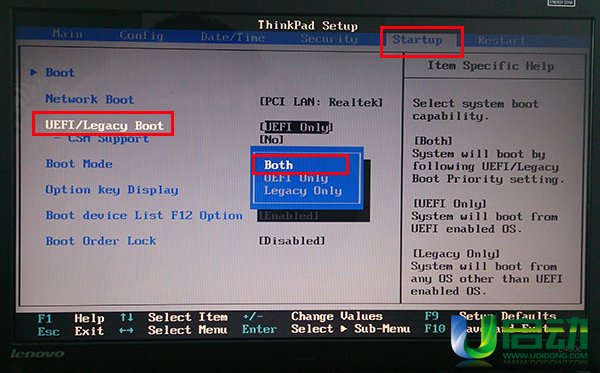 6、接著使用左右方向鍵將光標移至“startup”欄目,再使用上下方向鍵將光標移至“uefi/legacy boot”選項,按回車鍵,在彈出的選擇窗口中,使用上下方向鍵將光標移至“both”選項,按回車鍵確認,如下圖所示: