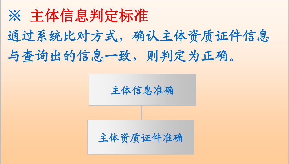 通過系統(tǒng)比對(duì),確認(rèn)主體名稱和證件號(hào)碼與查詢出的信息一致,則判定正確。